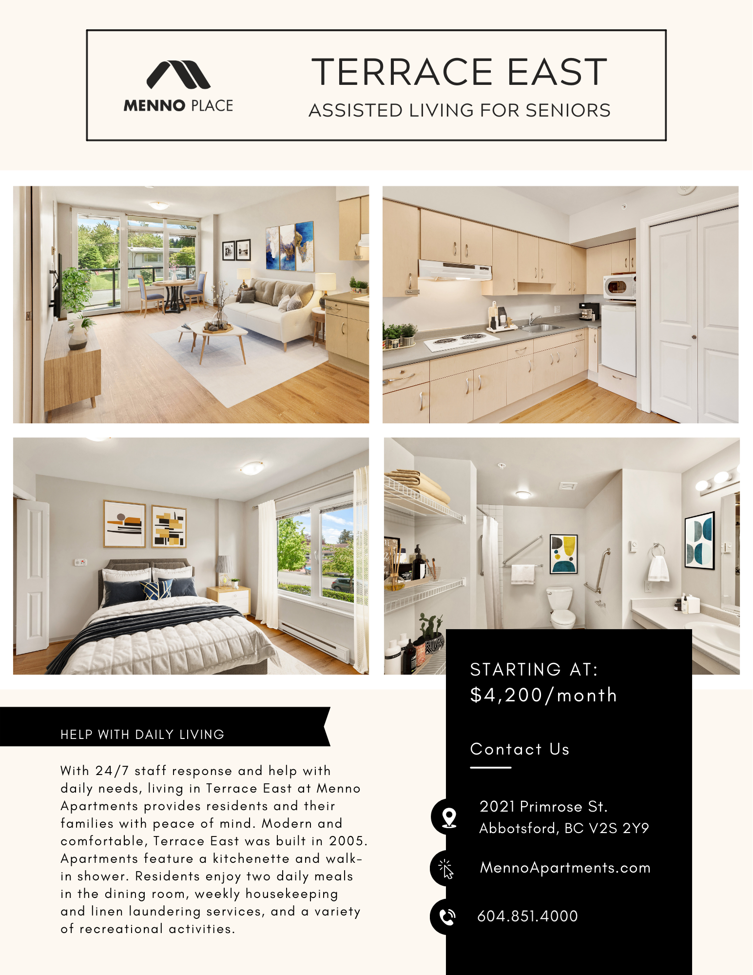 The suites in Terrace East are designated for Assisted Living (through Fraser Health or privately paid).