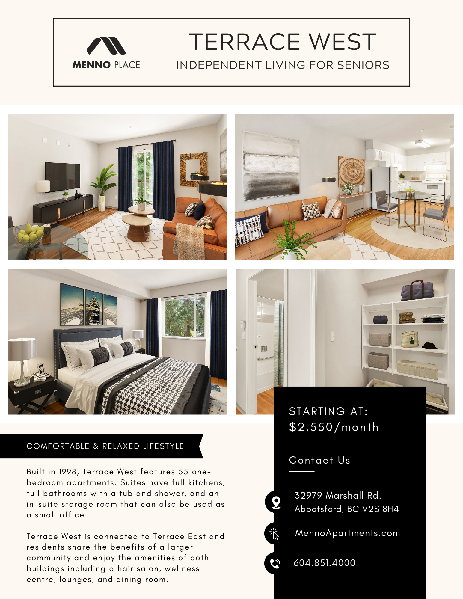 Terrace West was built in 1998 and has 55 suites in the apartment building. It is attached to Terrace East and the residents of Terrace West enjoy the amenities of both buildings including the Bistro, the hair salon, the wellness center, the lounges and the shared dining room.